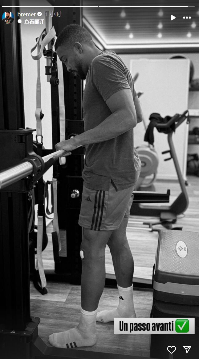 布雷默社媒晒图:身处健身房,正在进行收复性熟识。相片的右下角配额外大利语翰墨“Un passo avanti”,意为“上前一步”。
