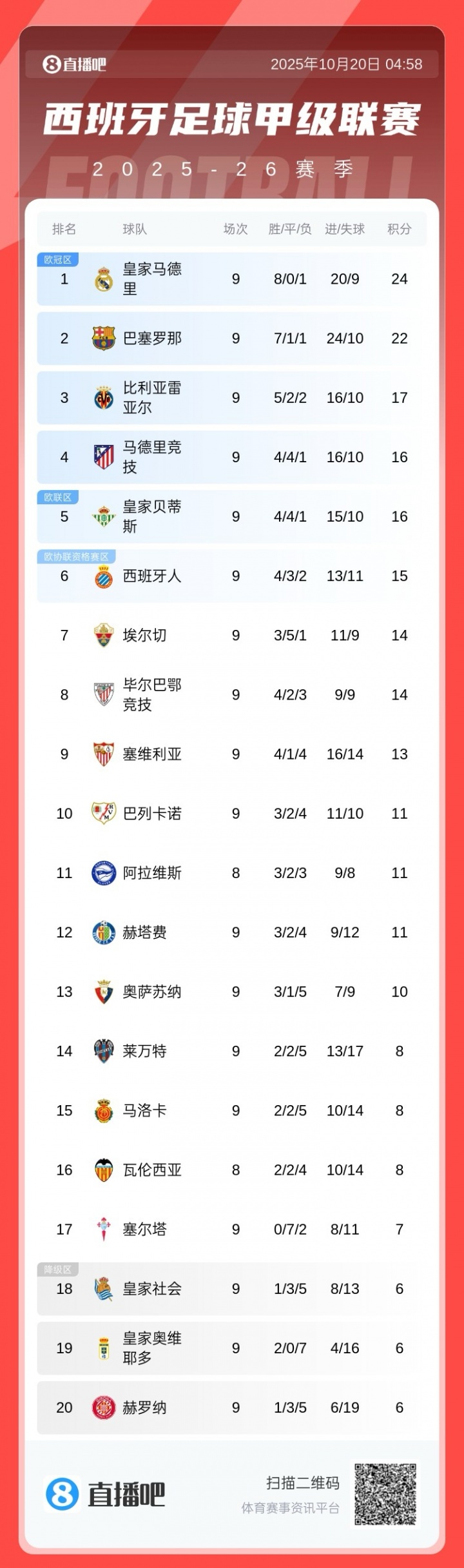 巴萨名次序二,比利亚雷亚尔第三,马竞第四。西甲第10轮10月26号将迎来国度德比,皇马主场迎战巴塞罗那。