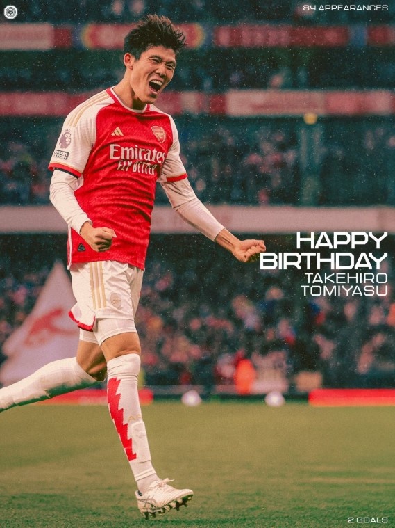 11月5日讯 阿森纳官方发文,为旧将富安健洋庆祝27岁诞辰。