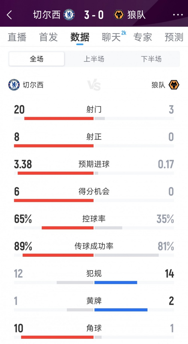 切尔西3-0狼队全场数据:射门20-3,射正8-0,得分契机6-0
