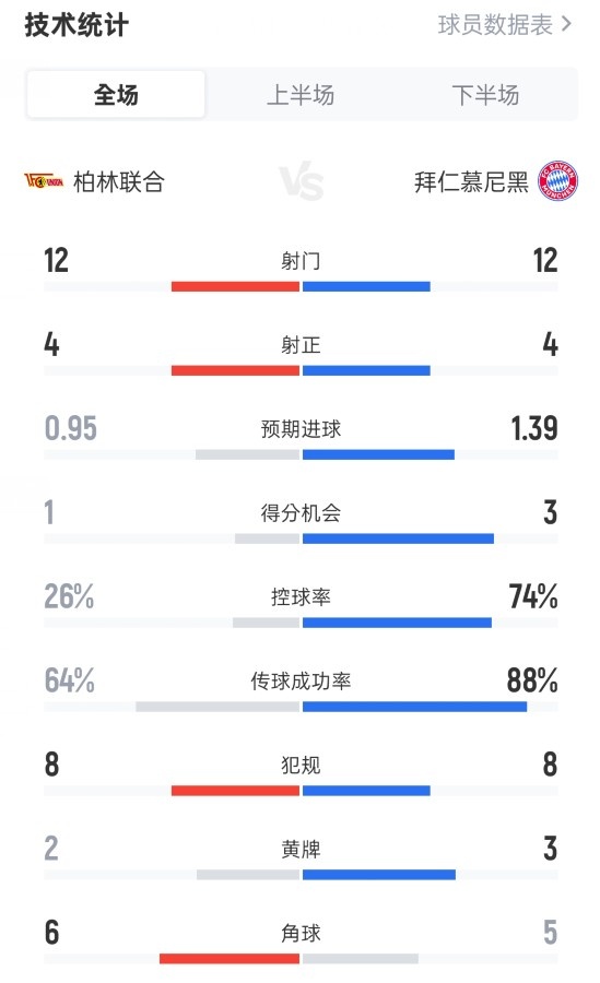 柏林取悦2-2拜仁全场数据:射门12-12,射正4-4,控球率26%-74%
