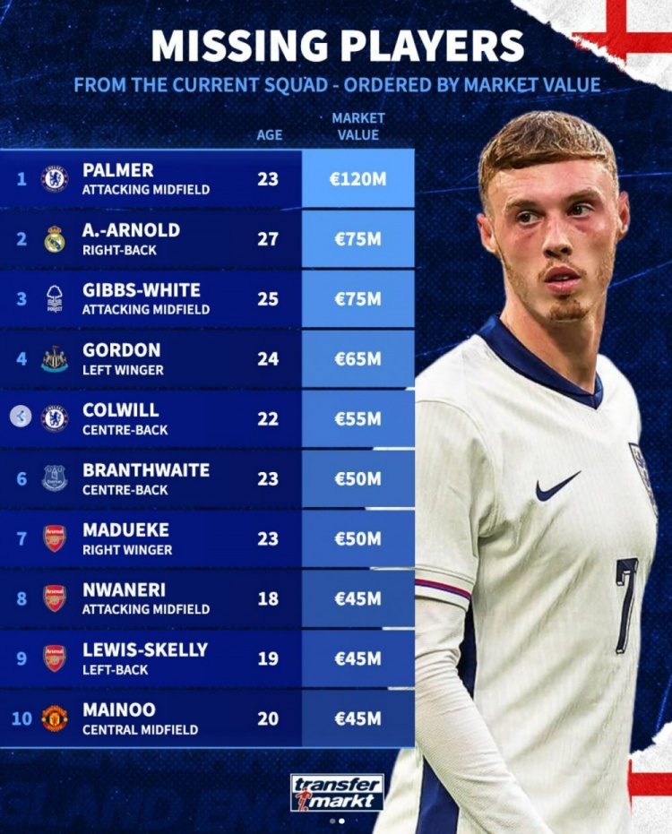 德转列缺席本期英格兰名只身价榜:帕尔默居首,阿诺德次席