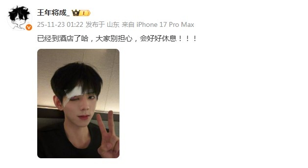 事情发生后,王年将成在今天凌晨更新微博,向外界报祯祥,默示“还是到旅店了哈,大师别牵挂,会好好休息”。像片中不错明晰看到,王年将成的眼眶出现红肿,眉骨也已被包扎起来。
