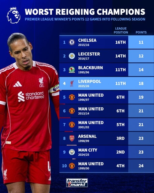 11月24日讯 利物浦在本轮英超焦点战主场0-3完败诺丁汉丛林,12轮联赛后仅积18分,《转会阛阓》统计清楚他们亦然同时战绩第4差的英超卫冕冠军。