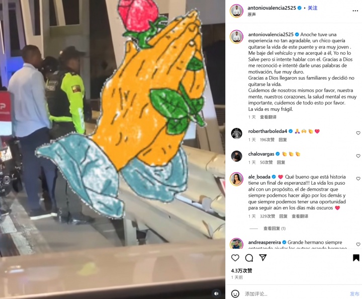 瓦伦西亚在社媒上共享了一段视频,他在本周早些技术发现又名年青男人准备从桥上跳下寻短见,他和窥伺规劝该男人撤废寻短见。